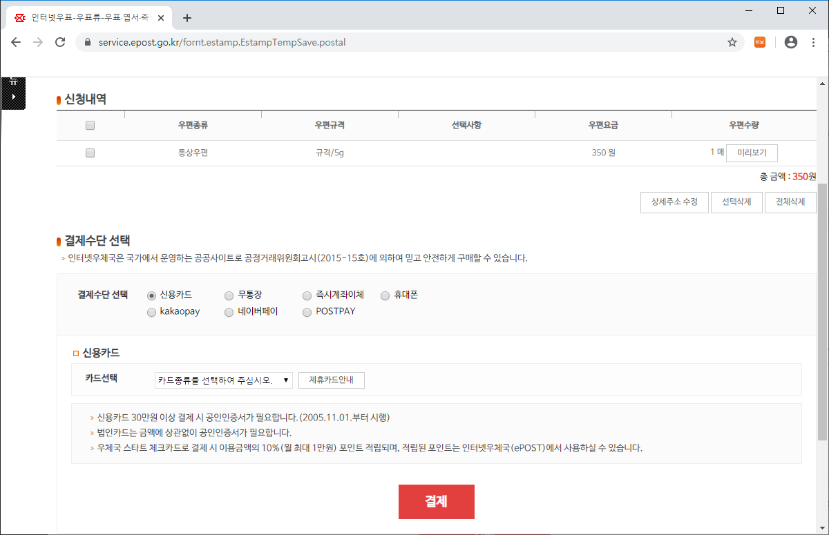 다양한 결제수단이 있으므로 편하신 방법을 이용하여 우표 값을 결제해주시면 됩니다.