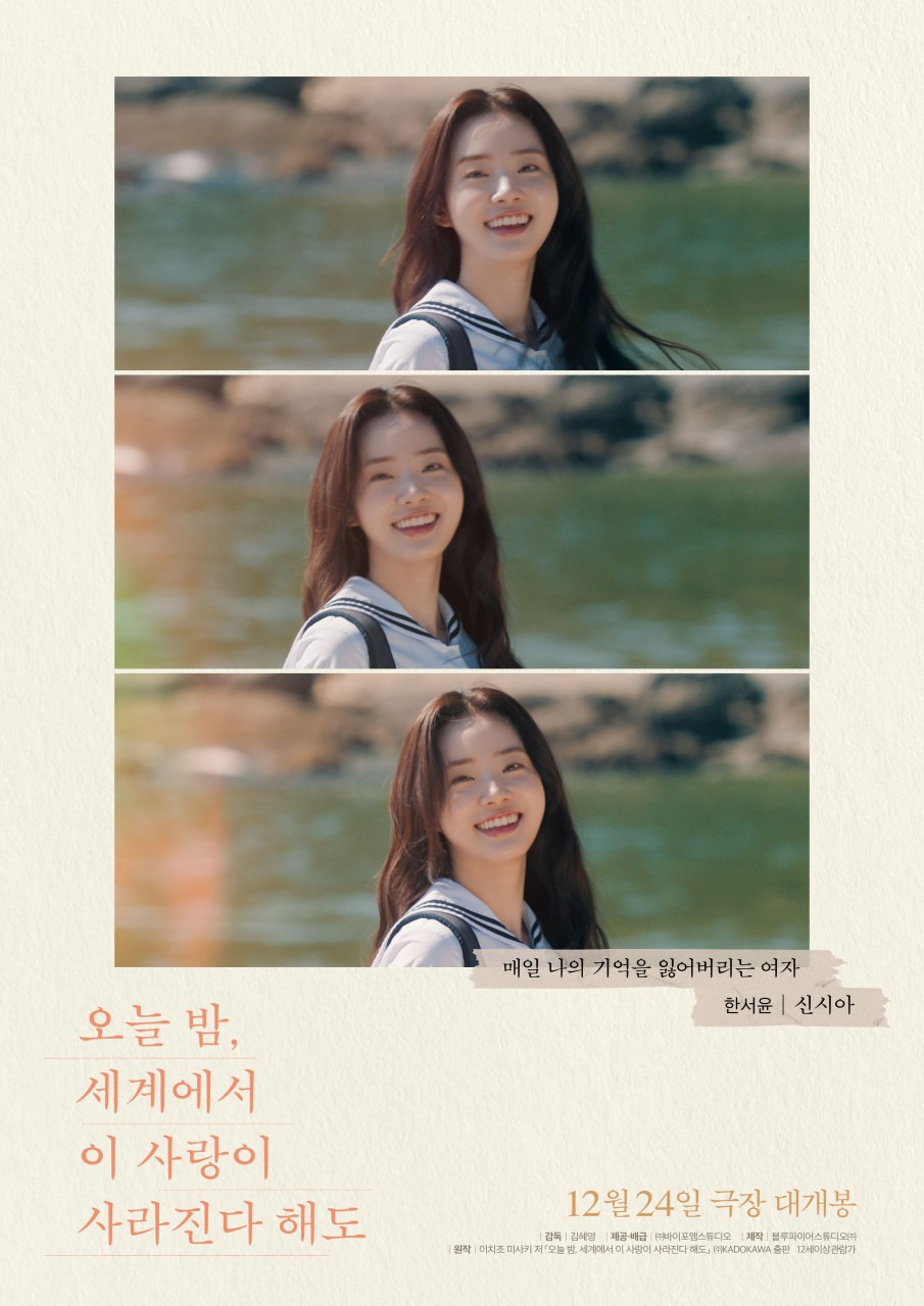 영화 <오늘 밤, 세계에서 이 사랑이 사라진다 해도>의 개봉이 하루 앞으로 다가왔습니다. (이하 오세이사) 영화 오세이사는 자고 일어나면 기억이 리셋되는 선행성 기억상실증을 앓는 여고생과, 무미건조한 일상을 살고 있는 평범한 남고생의 풋풋하고도 애틋한 사랑이야기를 담았다고 하는데요. 동명의 일본 소설을 원작으로 하고 있으며 추영우, 신시아, 진호은, 조유정 배우가 출연하는 것으로 알려져 있습니다.