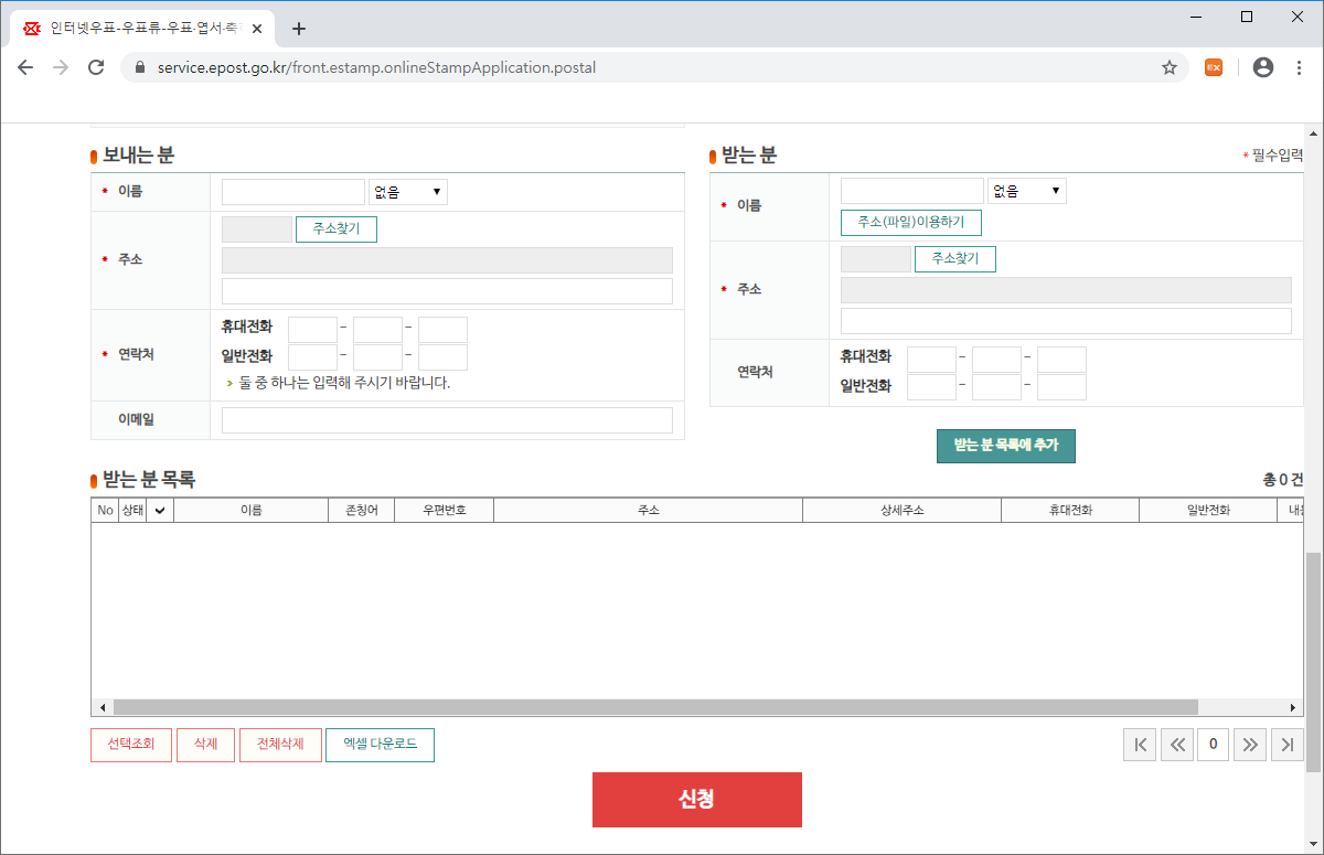 인터넷 우표 신청 페이지 입니다. 해당 페이지의 상단에 이는 동의 항목을 동의해주시고,