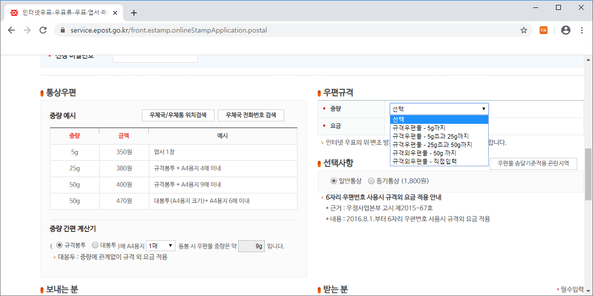 우표의 가격 안내가 있습니다. 그리고 오른쪽을 보시면 우편 규격 항목이 보이실 텐데요.
