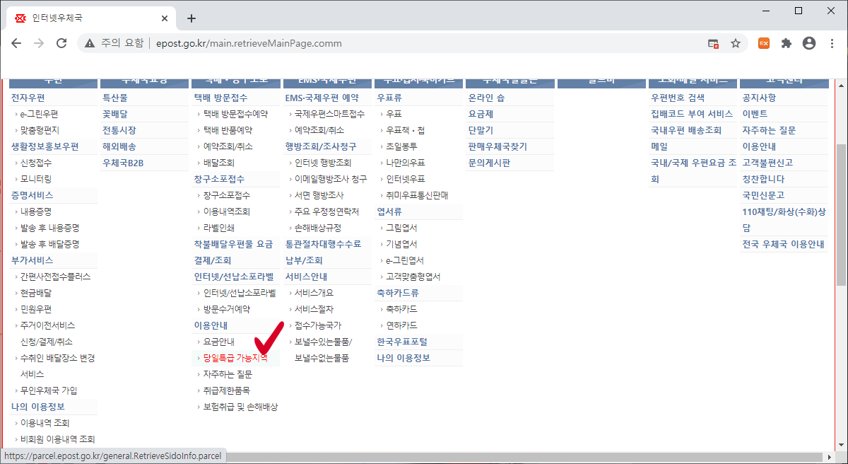 메뉴바를 클릭해주시면 우체국에서 제공하는 여러 가지 서비스 항목들이 나타납니다. 해당 항목들 중 당일특급 가능지역을 클릭해주시기 바랍니다.