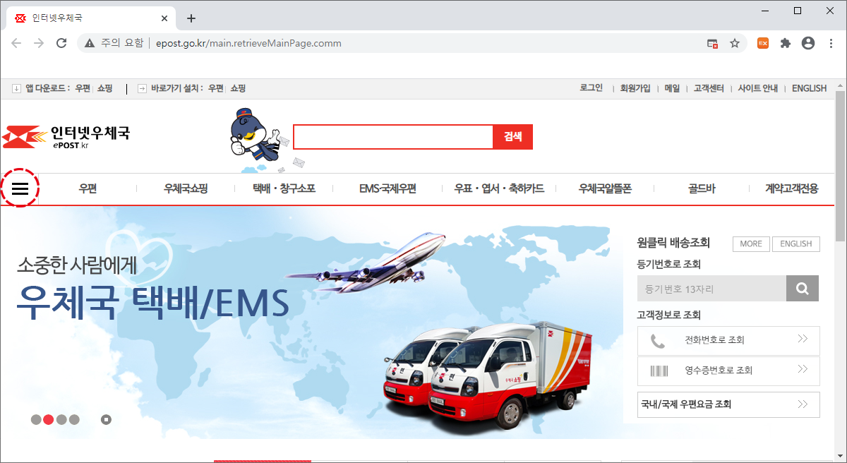 그렇다면 지금부터 우체국 당일특급 접수시간에 대해 알아보는 시간을 가져보려고 합니다. 하지만 모든 우체국들이 우체국 당일특급 서비스를 운영하는 것은 아닙니다. 때문에 우체국 당일특급 접수시간에 대해 알아보기 전에, 이용하고자 하는 우체국이 우체국 당일특급 서비스를 운영하는 곳인지 확인해볼 필요가 있습니다. 인터넷 우체국 홈페이지를 이용하시면 우체국 당일특급을 서비스를 운영하는 우체국에 대한 정보 확인이 가능합니다. 인터넷 우체국 홈페이지에 접속해주셨다면, 왼쪽 상단의 메뉴바를 클릭해주시면 됩니다.