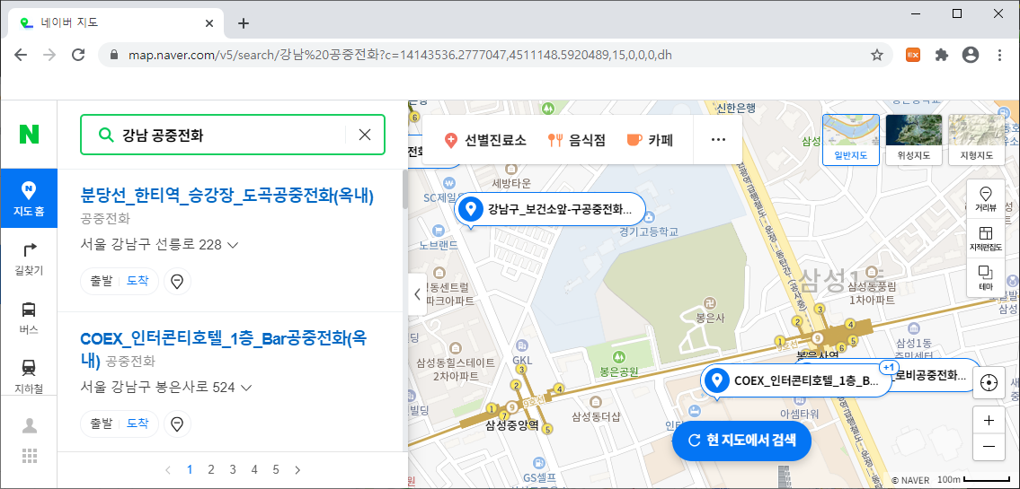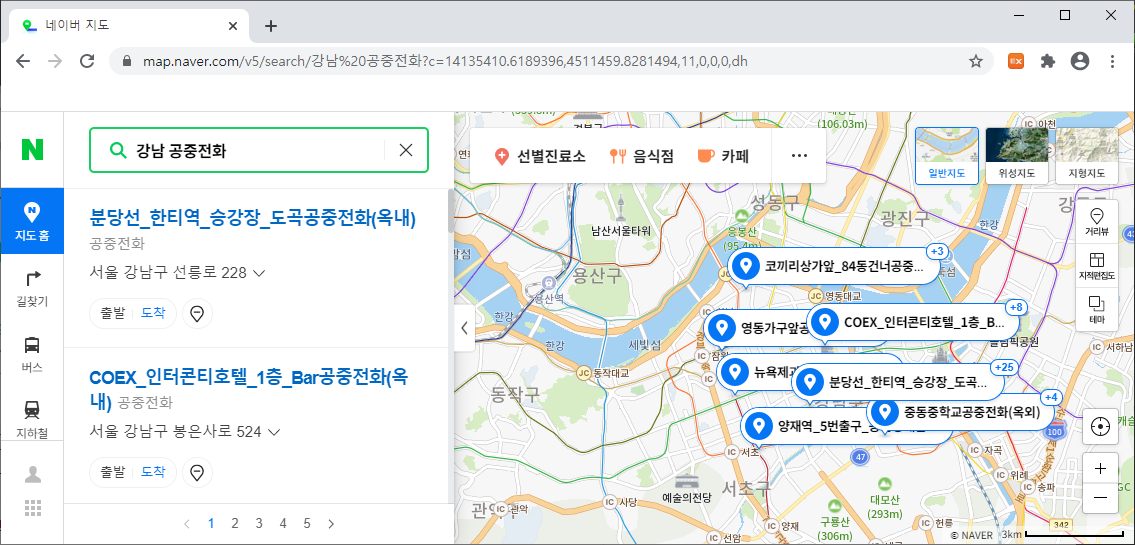 네이버 지도 사이트 또는 앱에 접속해주셨다면 '지역 + 공중전화'를 검색해줍니다. 검색해주시면 위와 같이 해당 지역에 있는 공중전화 위치가 나타납니다.