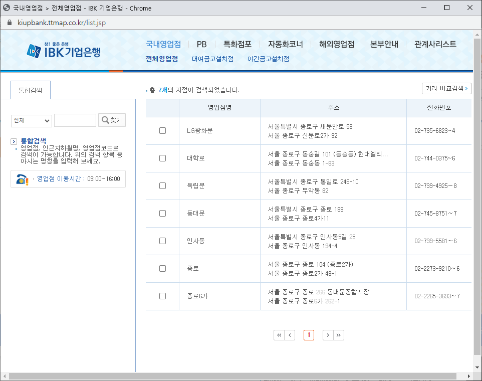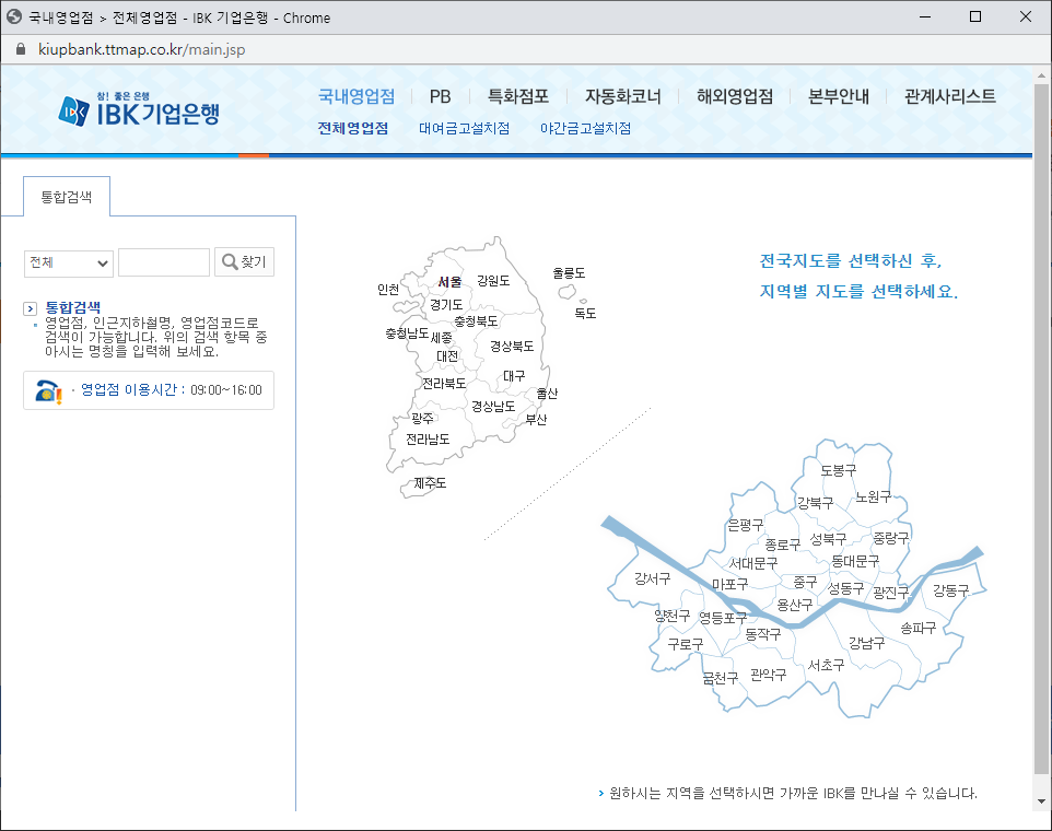 영업점 찾기를 클릭해주시면 위와 같은 창이 나타납니다. 해당 창에서 자신이 있는 지역을 선택해주시면 되겠습니다.