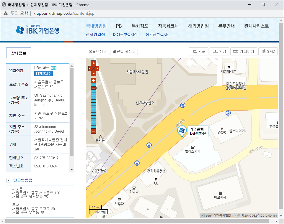 영업점명을 클릭한 후 나타나는 화면입니다. 영업점명과 주소, 위치, 전화번호는 물론 해당 위치까지 가는 빠른 길도 안내받을 수 있습니다. 다만 이 방법은 한 가지 주의점이 있습니다. 대부분의 기업은행 ATM 기기 옆에 공중전화가 위치해있기는 하지만, 간혹 가다 공중전화가 위치해있지 않은 경우도 있기 때문입니다. 이런 경우 수고스럽게 찾아갔는데, 헛걸음이 될 수 있으니 확인이 필요합니다. ATM 기기 위치를 네이버 지도, 카카오 맵 등에 검색하신 후 로드뷰를 이용하시면 확인할 수 있습니다. 두 가지 방법을 알려드렸으니 더 편하신 방법을 이용해주시면 되지만, 개인적으로는 처음 알려드린 네이버 지도 이용 방법이 더 편한 것 같다는 생각이 듭니다. 이상 공중전화 위치찾기 방법이었습니다.