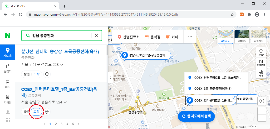 이용하고자 하는 공중전화 위치를 정했다면, 해당 공중전화 정보 아래에 있는 도착 버튼을 클릭하여 가는 길을 안내받을 수 있습니다.