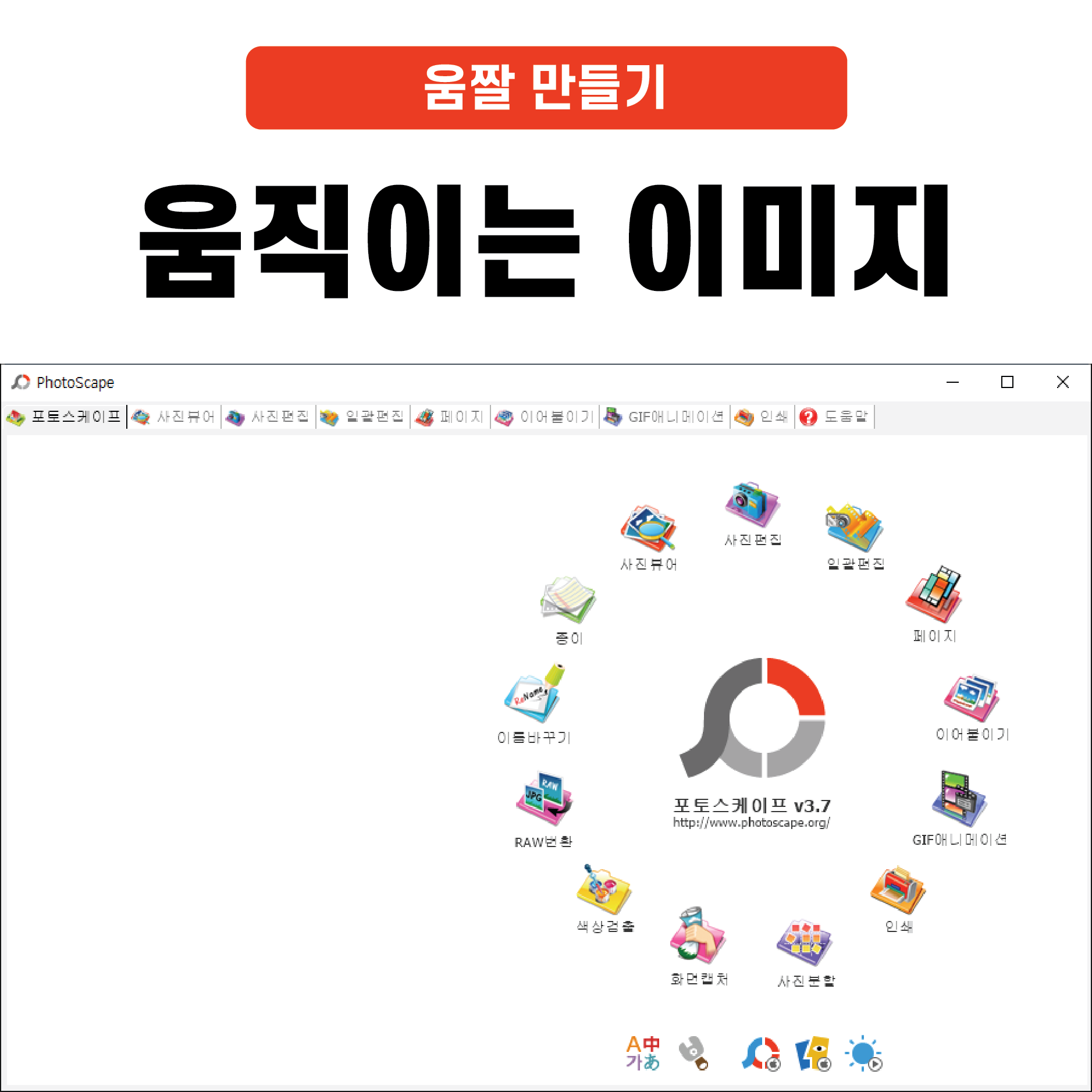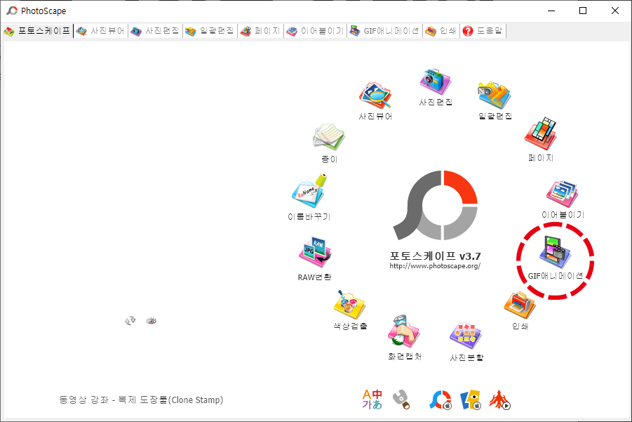 먼저, 포토스케이프를 다운로드하여줍니다. 다운로드한 후 해당 프로그램을 실행시켜주시면 위와 같은 화면이 나타나는데, 해당 화면에서 오른쪽 하단에 있는 GIF 애니메이션 메뉴를 클릭해주시면 됩니다.