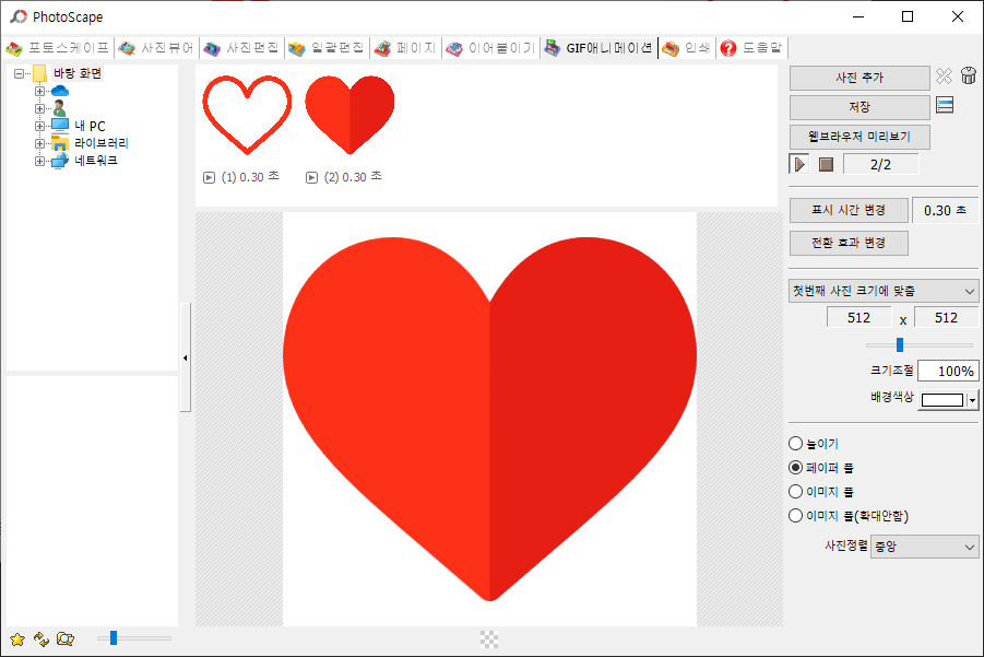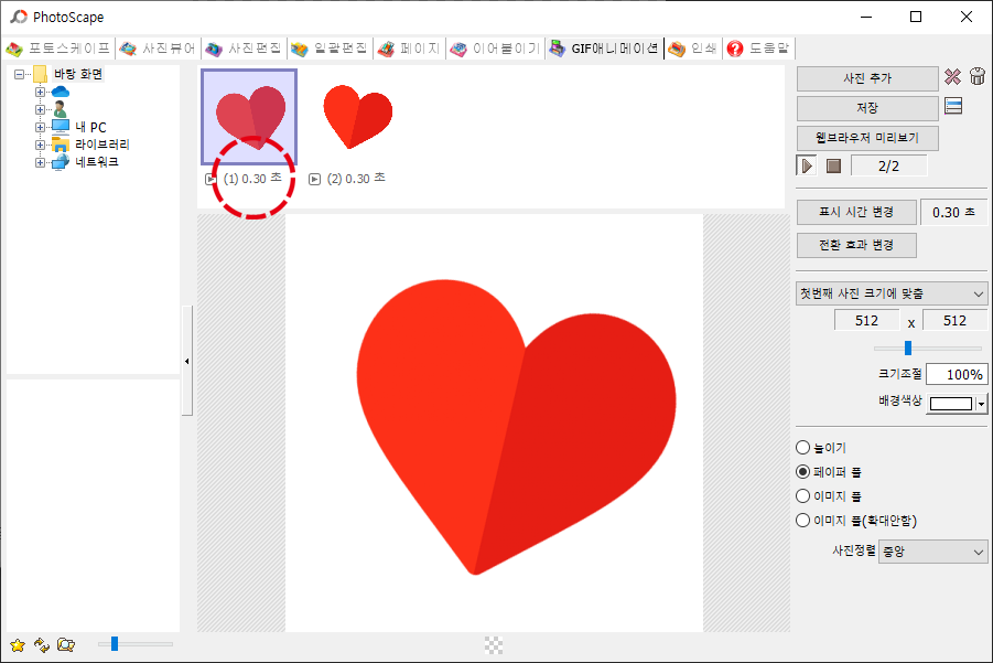 저는 살짝 위치가 다른 하트 이미지 두 장을 불러와주었습니다. 이미지를 불러와주시면 가운데 화면에 해당 이미지가 나타납니다.
