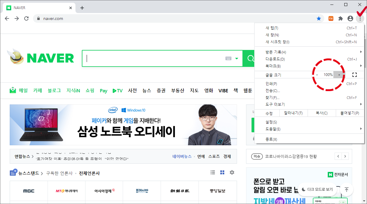 해당 아이콘을 클릭해주시면 새 탭, 새 창, 새 시크릿 창 등 여러 가지 항목들이 나타납니다. 조금 더 아래를 봐주시면 글꼴 크기 항목이 보이실 텐데, 해당 항목의 오른쪽에 -(마이너스), +(플러스) 버튼을 클릭하여 인터넷 글자크기 조절을 할 수 있습니다.