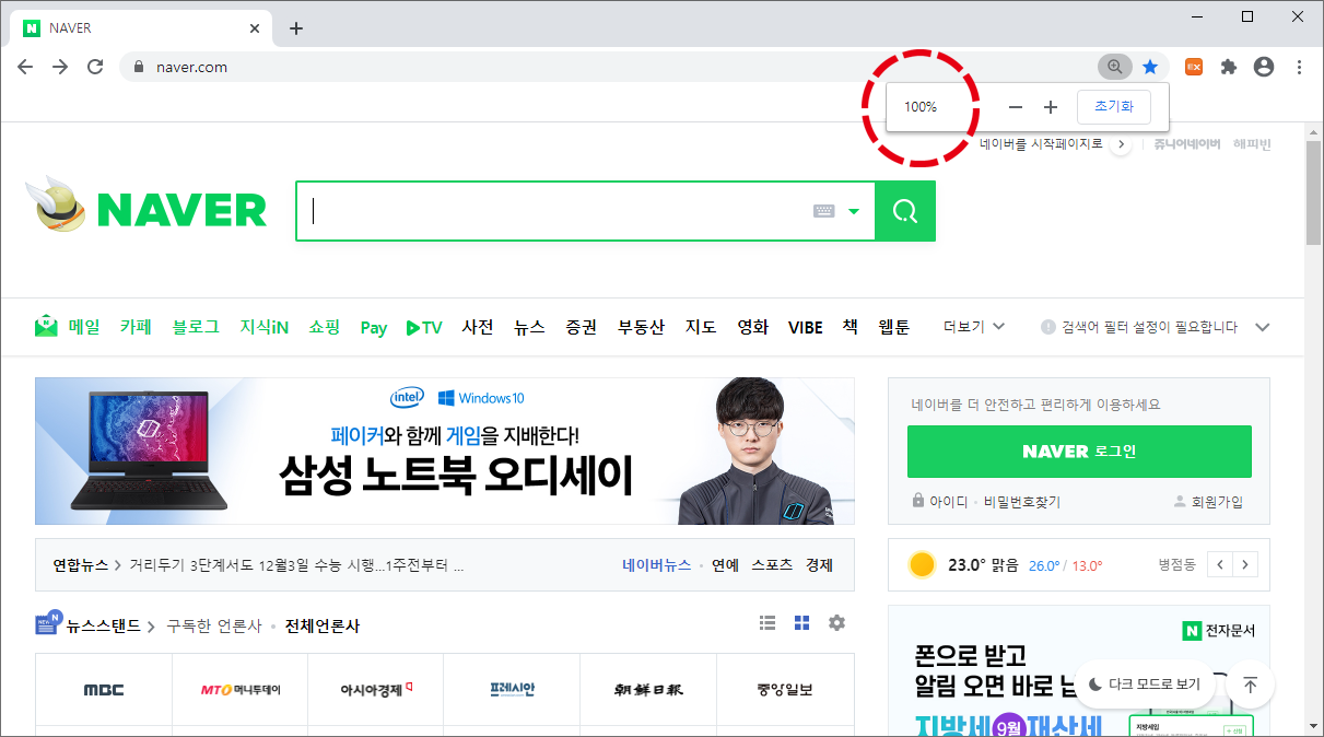 저는 크롬 브라우저를 실행시켜보았습니다. 보통 인터넷 창을 실행시켰을 때의 모습입니다. 글자와 그림, 사진들 모두 평소 많이 보던 익숙한 사이즈인 것을 확인할 수 있었습니다.