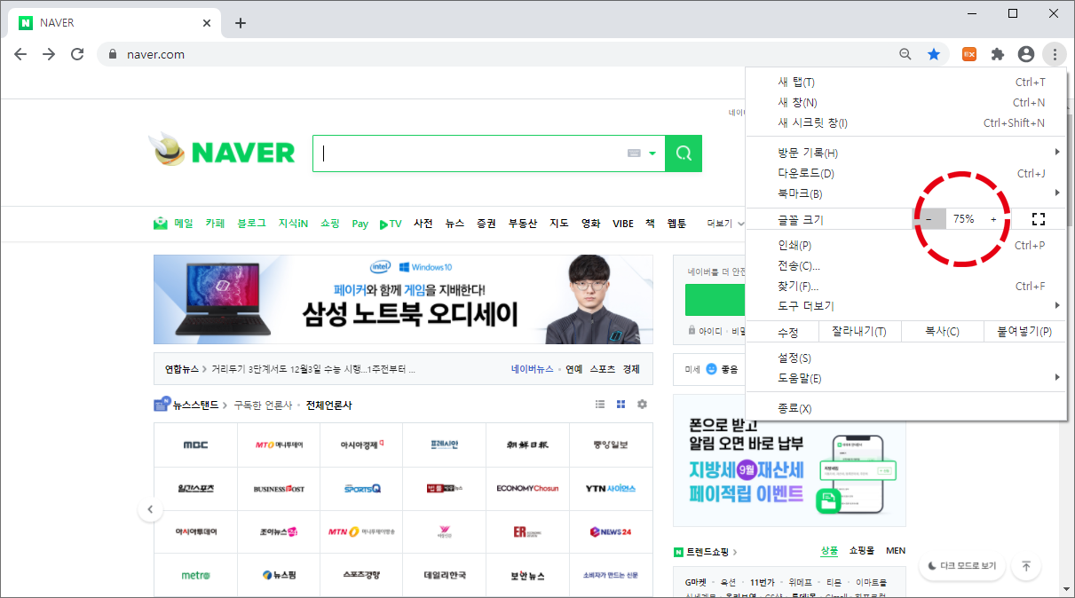 -(마이너스) 버튼을 클릭하여 글꼴 크기를 75%로 줄여보았습니다. 바로 인터넷 창에 반영되어 글자 크기가 작아진 것을 확인할 수 있습니다.