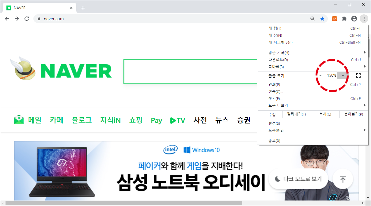 이번에는 (+) 버튼을 클릭하여 150%로 늘려보았습니다. 인터넷 창의 글씨와 사진, 그림이 모두 커졌습니다.