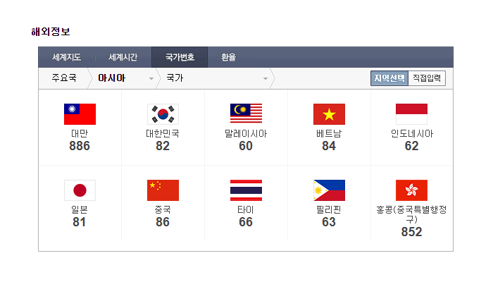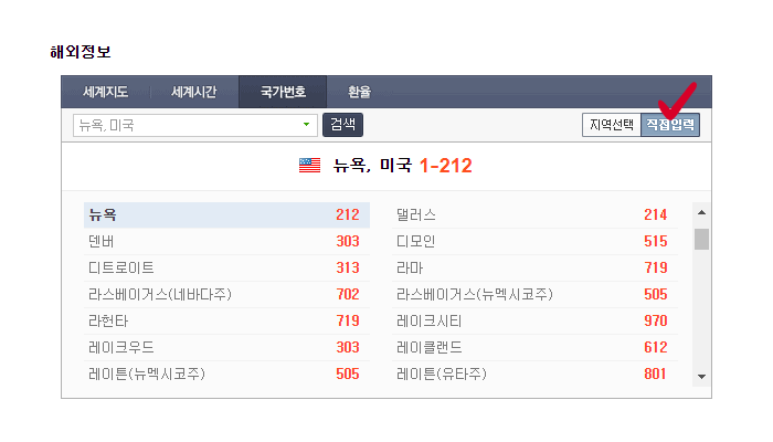 자신이 찾고자 하는 국가를 찾기 힘들다면 직접 입력 기능을 이용하여 국가번호를 검색할 수도 있습니다. 오른쪽 상단의 직접입력 버튼을 클릭하신 후, 왼쪽의 검색창에 원하는 지역을 검색해주시기만 하면 됩니다.