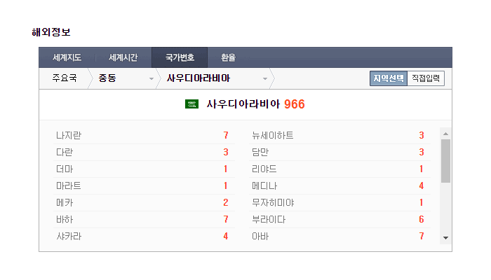 국가번호뿐만 아니라 지역번호 역시 쉽게 확인할 수 있습니다. 지역번호 확인은 국가 번호를 클릭해주시면 나타납니다. 이미지를 봐주시면 나지란은 7, 다란은 3, 더마는 1, 마라트는 1, 메카는 2, 바하는 7, 샤카라는 4, 뉴세이하트는 3, 담만은 3, 리야드는 1, 메디나는 4, 무자히미야는 1, 부라이다는 6, 아바는 7입니다. 이때 지역번호만 입력해주시면 안 되고, 국가번호와 지역번호를 함께 입력해주셔야 합니다. 따라서 아바는 966-7이 됩니다.