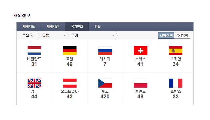 다음은 유럽 국가번호 입니다. 네덜란드 31, 독일 49, 러시아 7, 스위스 41, 스페인 34, 영국 44, 오스트리아 43, 체코 420, 폴란드 48, 프랑스 33.