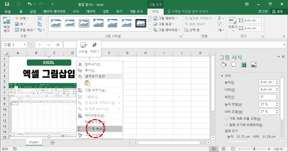 그림을 선택한 후 마우스 우클릭 - 크기 및 속성 클릭을 해주시면 좀 더 상세한 그림 설정을 할 수도 있습니다. 엑셀 프로그램 오른쪽 화면을 봐주시면 그림 서식 창이 생겼습니다. 해당 창을 통해 해당 그림을 원하는 크기로 설정할 수 있고, 그림 회전이나 높이와 너비 조절도 가능합니다.