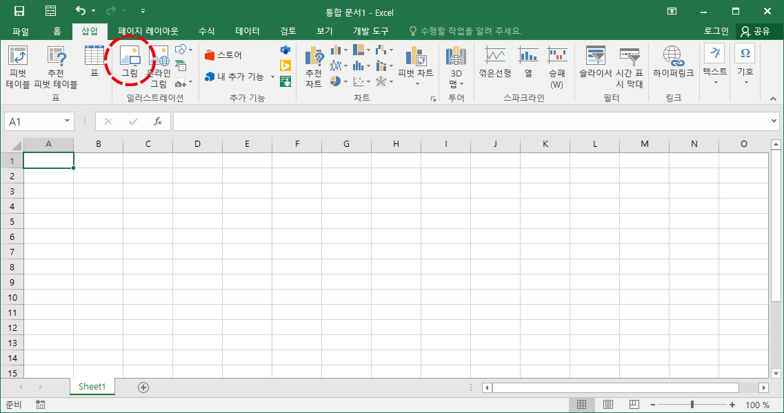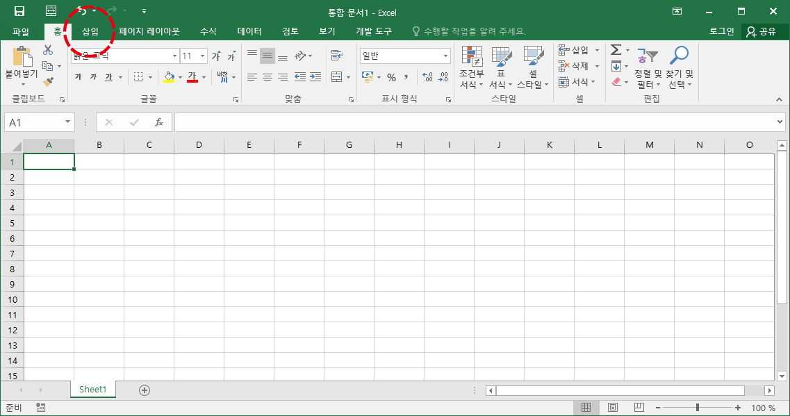 먼저, 엑셀 프로그램을 실행합니다. 엑셀 프로그램을 실행한 뒤 상단을 보면 파일, 홈, 삽입, 페이지 레이아웃, 수식, 데이터, 검토, 보기, 개발 도구 등의 탭이 있습니다. 처음 엑셀을 실행했을 때는 두 번째에 있는 홈 탭으로 선택이 되어있을 텐데, 세 번째에 위치한 삽입 탭을 선택해줍니다.