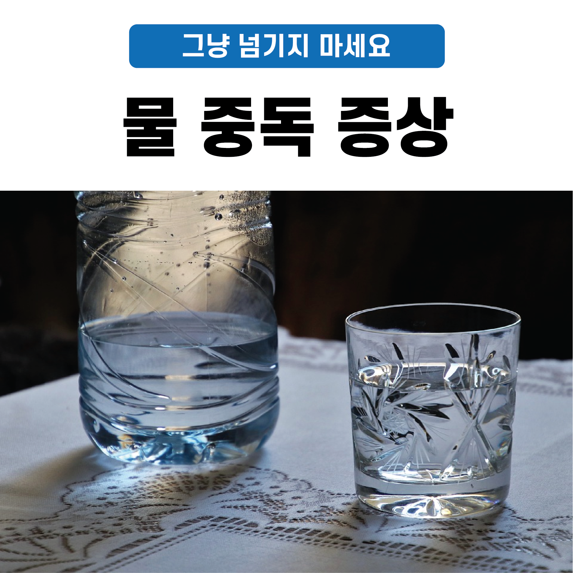 요즘 현대인들은 물 보다 커피, 술, 음료 등을 더 많이 섭취하기 때문에 물 중독보다는 몸에 물이 부족할 가능성이 훨씬 큽니다. 그러니 하루 1L ~ 2L 정도의 물은 걱정 없이 섭취하시되, 한 번에 많이 마시기보다는 조금씩 자주 섭취하시는 것을 권해드립니다.