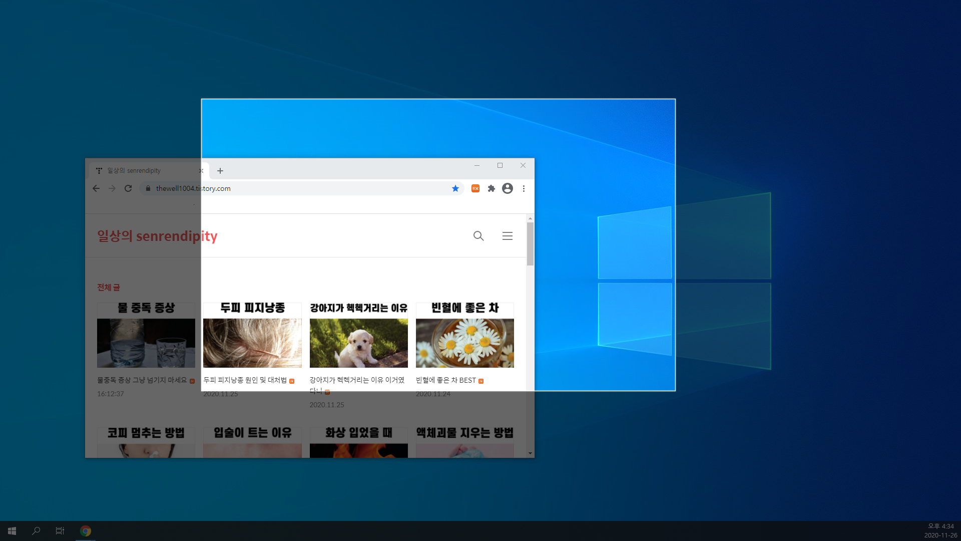 Windows 키와 Shift 키, S 키를 동시에 눌러주시면 컴퓨터의 전체 화면이 어두워지는데, 이때 마우스를 이용하여 캡처하고자 하는 곳을 지정해주시면 되겠습니다.