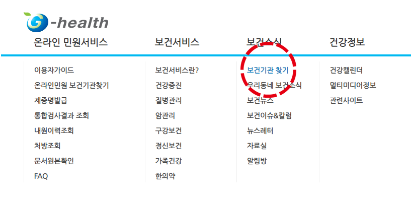'보건 소식' 위에 마우스를 대주시면 보건 기고나 찾기, 우리 동네 보건소식, 보건 뉴스, 보건이슈&칼럼, 뉴스레터, 자료실, 알림방 등의 세부 카테고리가 나옵니다. 해당 카테고리들 중 첫 번째에 있는 보건기관 찾기를 클릭해줍니다.