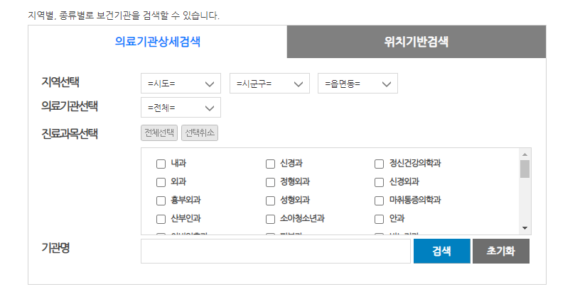 검색 방법은 의료기관 상세검색과 위치기반 검색 두 가지입니다. 의료기관 상세검색은 지역 선택(시·도, 시·군·구, 읍·면·동), 의료기관 선택(보건의료원, 보건소, 보건지소, 보건진료소, 종합병원, 병원, 요양병원, 의원 등), 진료과목 선택(내과, 신경과, 정신건강의학과, 외과, 정형외과, 신경외과, 흉부외과 등)을 통해 검색할 수 있습니다. 만약 가고자 하는 기관명을 알고 계실 경우 바로 기관명을 검색해주시면 됩니다.