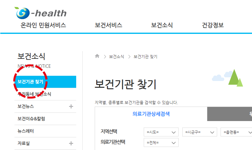 '보건 소식' 위에 마우스를 대주시면 보건 기고나 찾기, 우리 동네 보건소식, 보건 뉴스, 보건이슈&칼럼, 뉴스레터, 자료실, 알림방 등의 세부 카테고리가 나옵니다. 해당 카테고리들 중 첫 번째에 있는 보건기관 찾기를 클릭해줍니다.