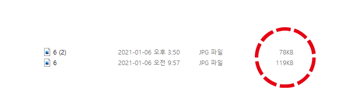 위에 있는 파일이 그림판 사진 용량 줄이기 작업 후, 아래 있는 파일이 작업 전입니다. 작업 후 41KB만큼의 용량이 줄어든 것을 확인할 수 있습니다. 별도 프로그램 설치 없이, 그림판 만으로도 사진 용량을 줄일 수 있습니다.