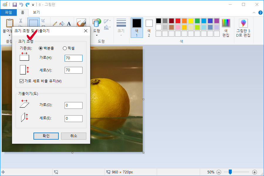 크기를 줄일 때 가로 세로 비율 유지에 체크를 해주시면, 작업 후 이미지의 비율이 이상해지는 것을 막을 수 있습니다.