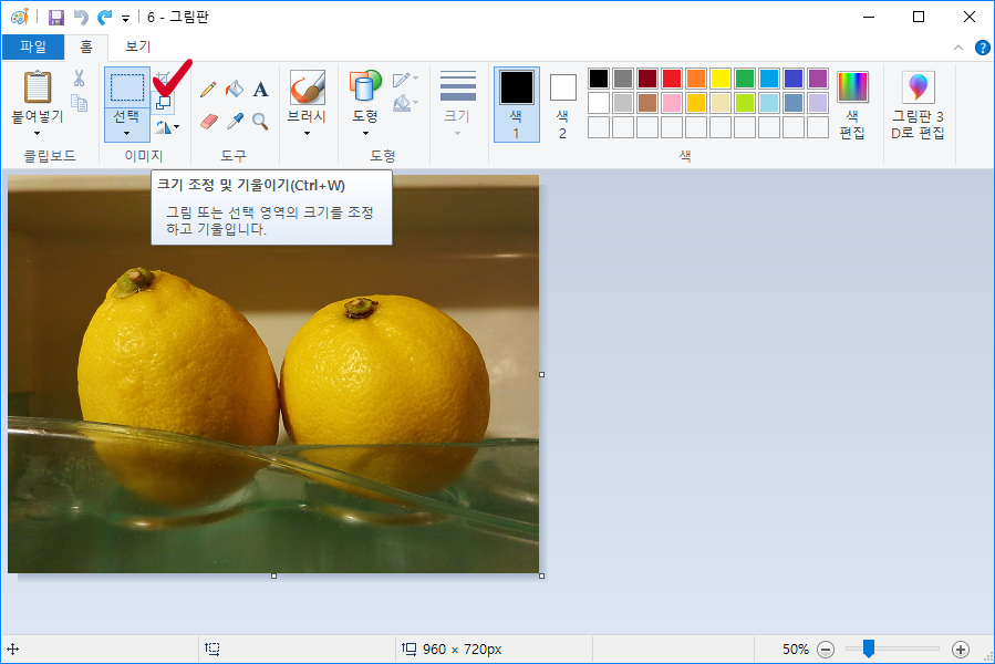 그림판 사진 용량 줄이기 작업을 하기 위해 상단의 크기 조정 및 기울이기 기능을 클릭해줍니다. 키보드 단축키 Ctrl + W를 눌러주셔도 됩니다. '그림 또는 선택 영역의 크기를 조정하고 기울입니다.'라는 설명이 나타납니다.