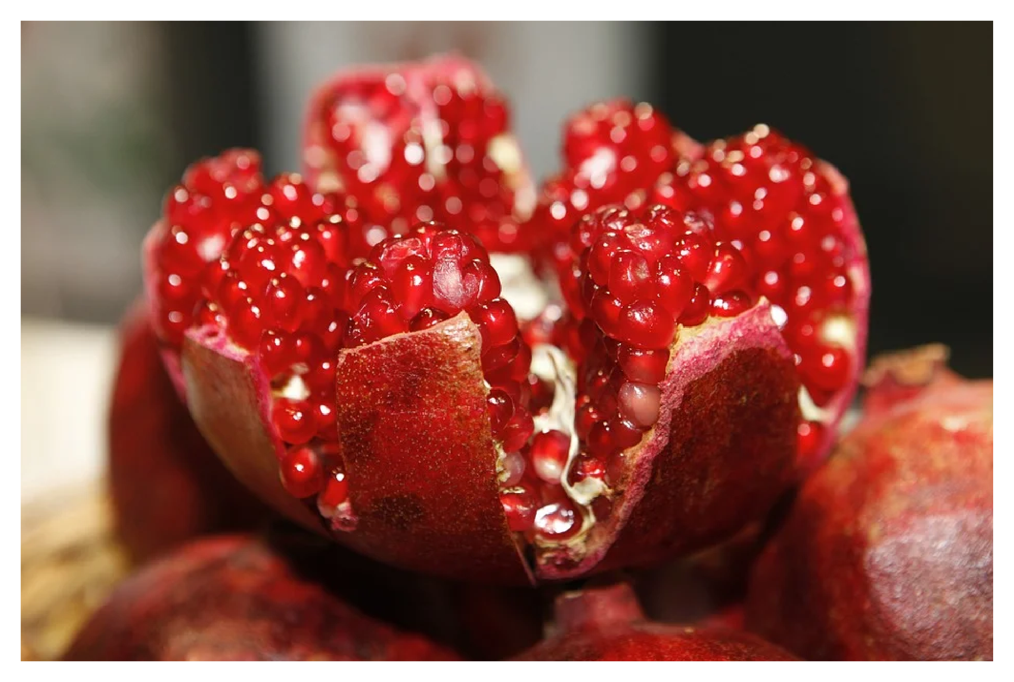 비타민이 많아 감기 예방에 좋고, 석류의 씨앗을 싸고 있는 막에는 천연 에스트로겐 호르몬 성분이 함유되어 있어 갱년기 장애 예방 효과도 있습니다.
