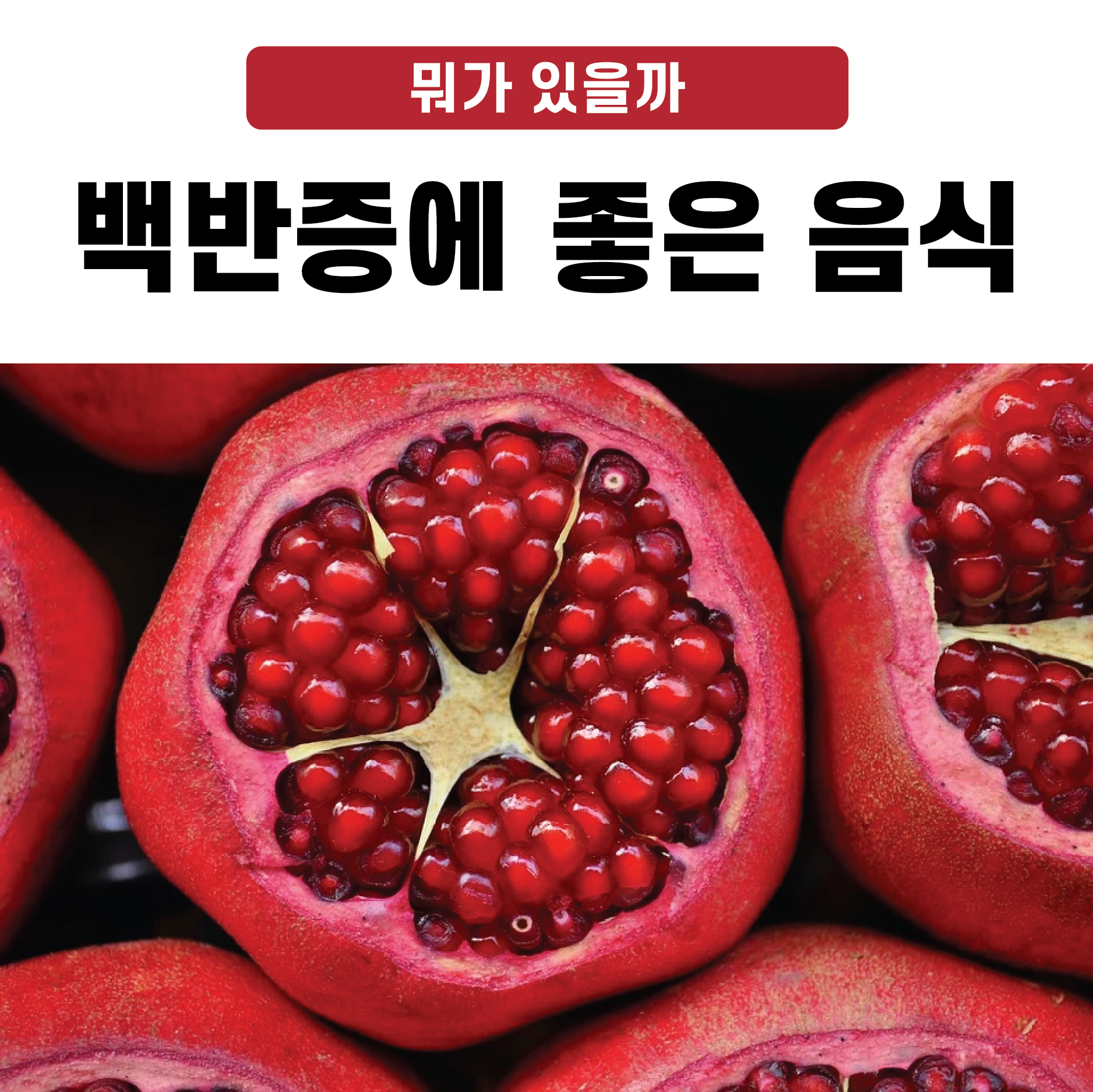 석류는 항산화 성분의 함유율이 높기 때문에 백반증에 좋은 음식입니다. 뿐만 아니라 노화를 예방하고, 피부를 좋게 하는 효과가 있습니다. 또한 여성호르몬 유사 성분이 풍부하여 여성을 위한 과일이라고도 불립니다.