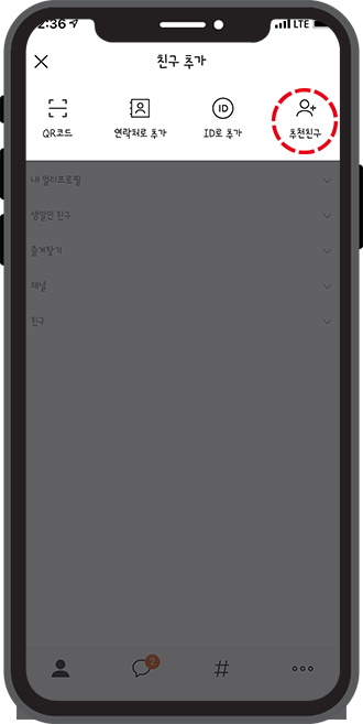 친구 추가 아이콘을 눌러주시면 QR코드, 연락처로 추가, ID로 추가, 추천 친구 등 친구를 추가할 수 있는 여러 가지 방법들이 나타납니다. 네 번째에 있는 추천 친구 아이콘을 눌러주시면 됩니다.