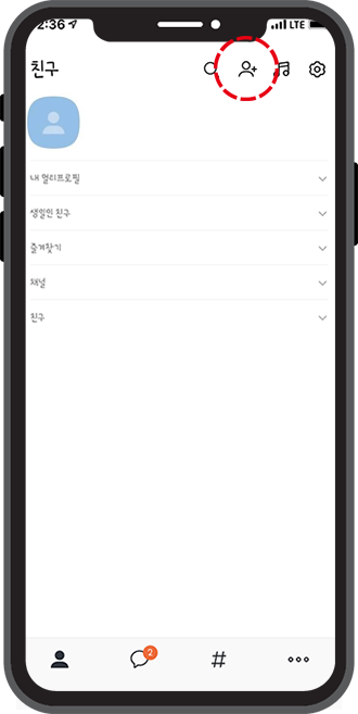 카카오톡 앱을 접속해주시면 위와 같은 화면을 볼 수 있습니다. 해당 화면에서 오른쪽 상단을 봐주시면 네 개의 아이콘이 보이실 텐데, 해당 아이콘들 중 두 번째에 있는 친구 추가 아이콘을 눌러줍니다.