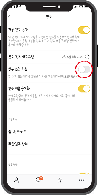친구 메뉴로 접속해주시면 자동 친구 추가, 친구 목록 새로 고침, 친구 추천 허용 등 다양한 세부 메뉴들이 있습니다. 세 번째에 있는 친구 추천 허용 기능을 꺼주시면 끝입니다.