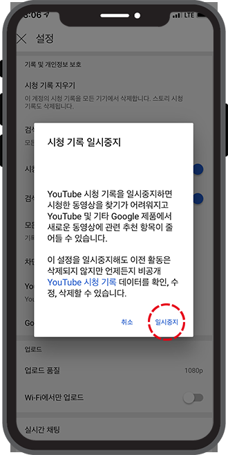 시청 기록 일시중지 안내 창이 나타났습니다. 오른쪽 하단의 '일시중지'를 클릭해주시면, 제가 앞으로 시청하는 동영상 기록은 남지 않아요. 매우 간단하죠? 여러분들도 성공적인 유튜브 시청기록 삭제, 검색기록 삭제하실 수 있길 바랍니다 :)