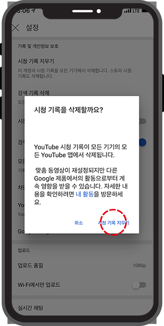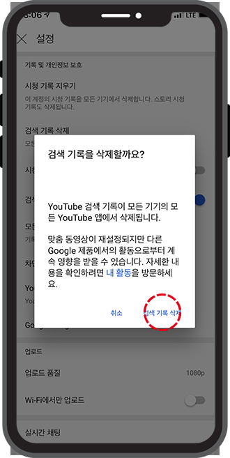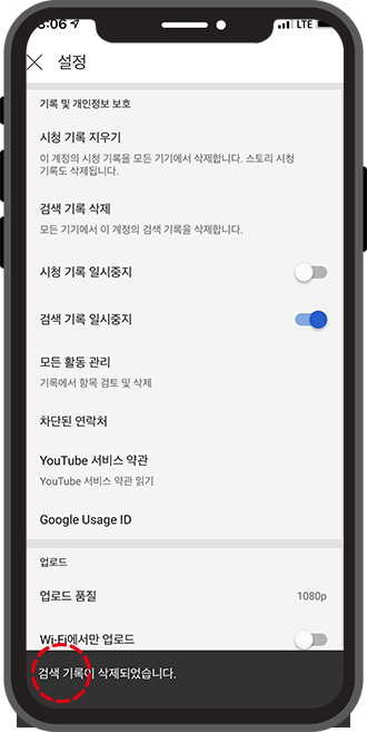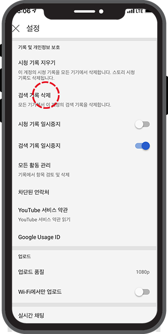 이번에는 유튜브 검색기록 삭제 차례입니다. 앞에서 했던 것과 마찬가지로, 검색 기록 삭제를 클릭해주세요.