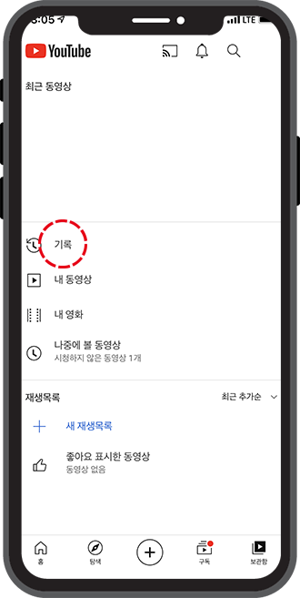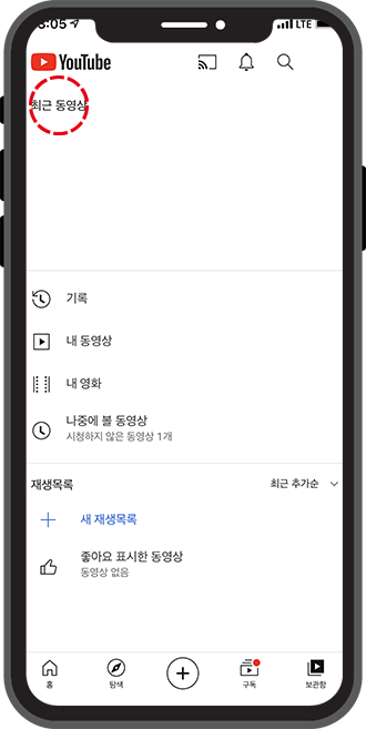 먼저, 유튜브 앱을 실행시켜주세요. 하단을 보시면 홈, 탐색, 구독, 보관함 등 다섯 개의 아이콘이 있습니다. 하단의 아이콘들 중, 가장 오른쪽에 있는 보관함을 클릭해보세요.
