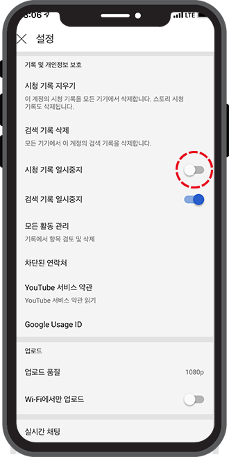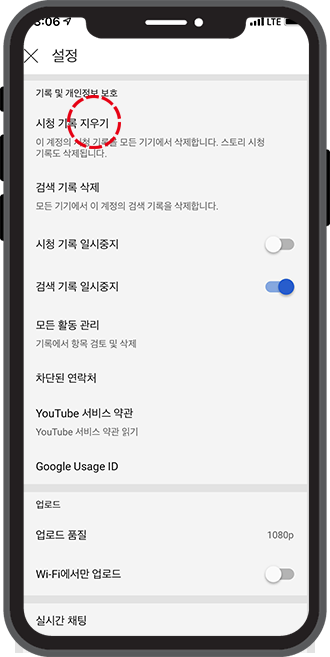 기록 및 개인정보 보호 카테고리를 통해 유튜브 검색기록 삭제, 시청기록 삭제, 기록 중지 설정 등을 할 수 있는데요. 그중에서도 먼저 시청기록 지우기를 해보도록 하겠습니다.