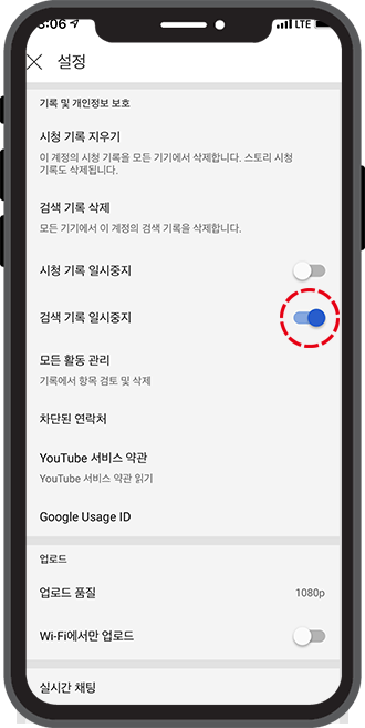 보시다시피 검색 기록 일시중지 기능은 켜져 있습니다. 이 기능이 켜져 있는 한, 제가 유튜브에서 검색한 내용은 저장되지 않아요.