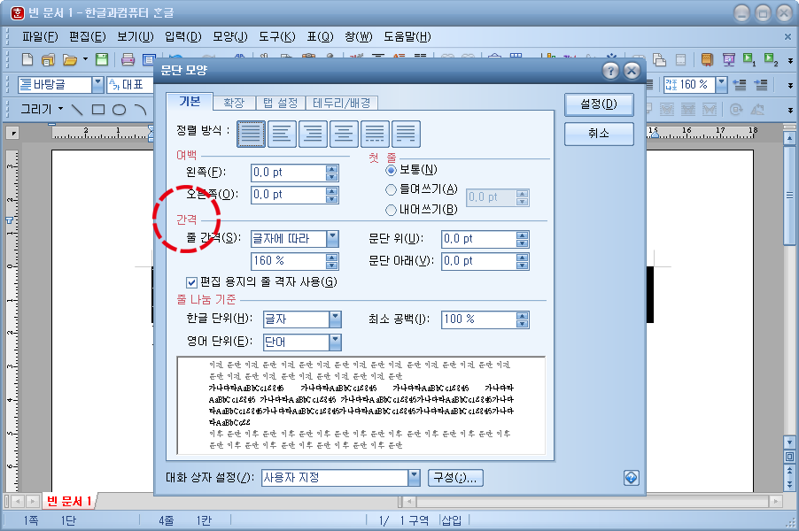설정을 마쳤다면 오른쪽 상단의 설정 버튼을 클릭해줍니다. 이로 인해 한글 줄간격 설정을 완료할 수 있습니다.
