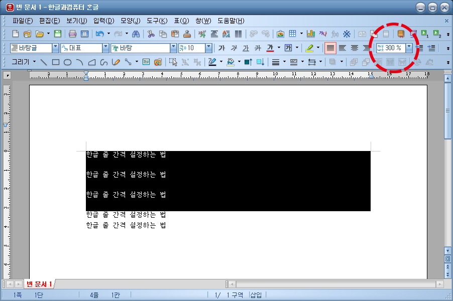 한글 줄간격 설정 예시를 보여드리기 위해 300%을 클릭해보았습니다. 보시다시피 줄 간격이 넓어진 것을 확인할 수 있습니다.
