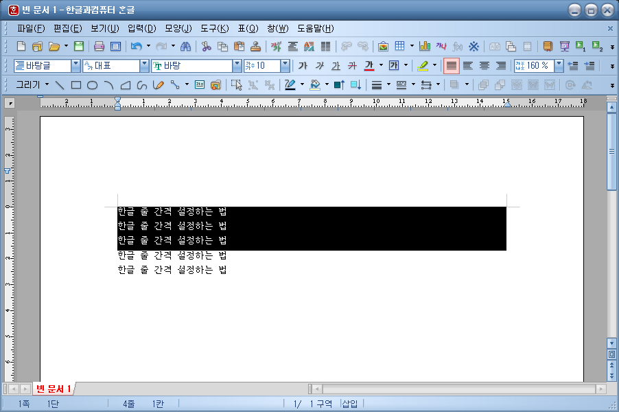 한글 줄간격 설정 두 번째 방법입니다. 위에서 알려드린 방법 외에도 한 가지 방법이 더 있습니다. 마찬가지로 한글 줄간격 설정을 해줄 구간을 선택해주셔야 합니다.