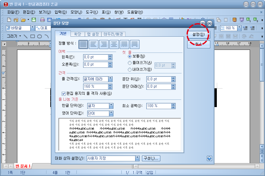 설정을 마쳤다면 오른쪽 상단의 설정 버튼을 클릭해줍니다. 이로 인해 한글 줄간격 설정을 완료할 수 있습니다.