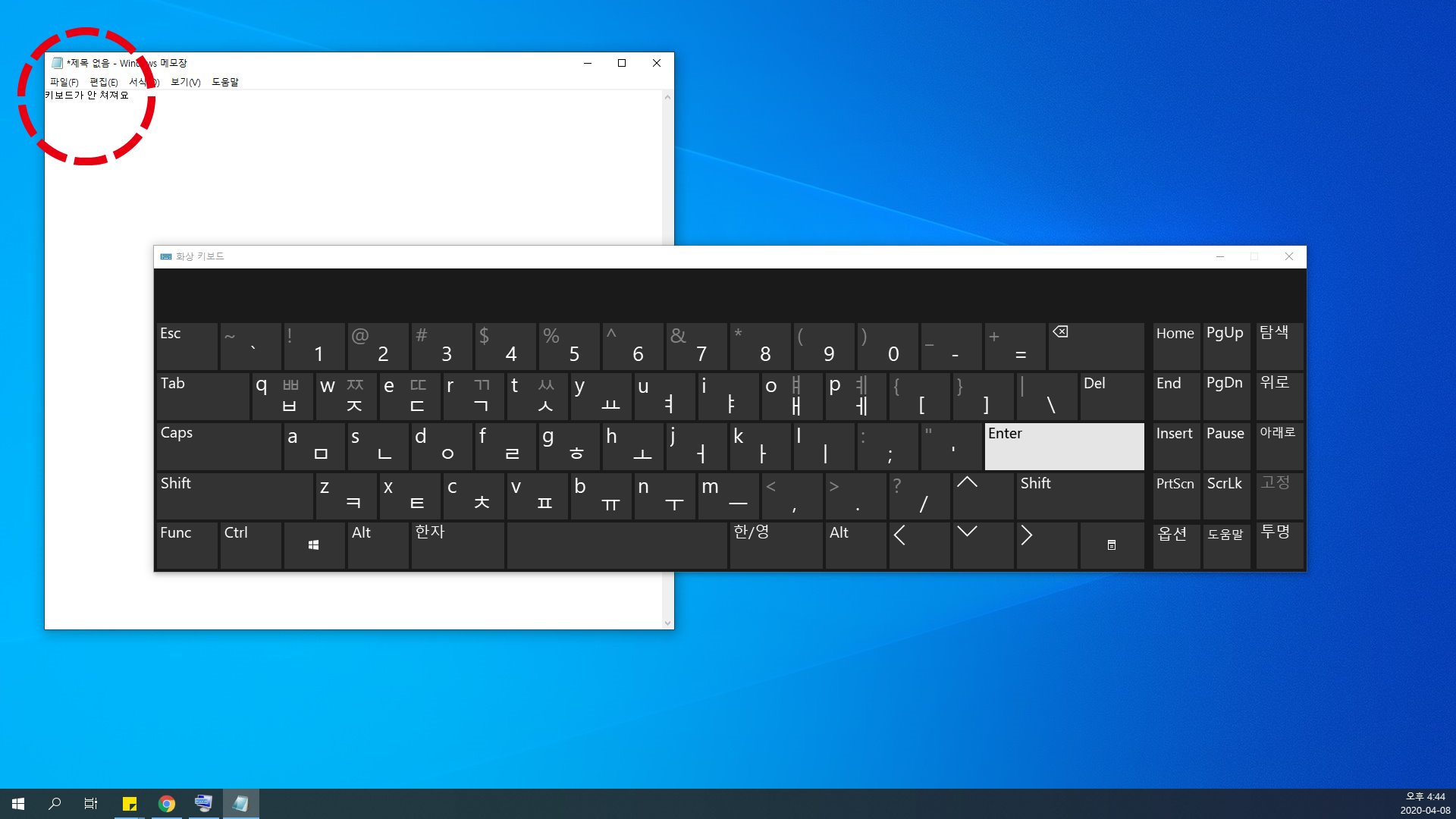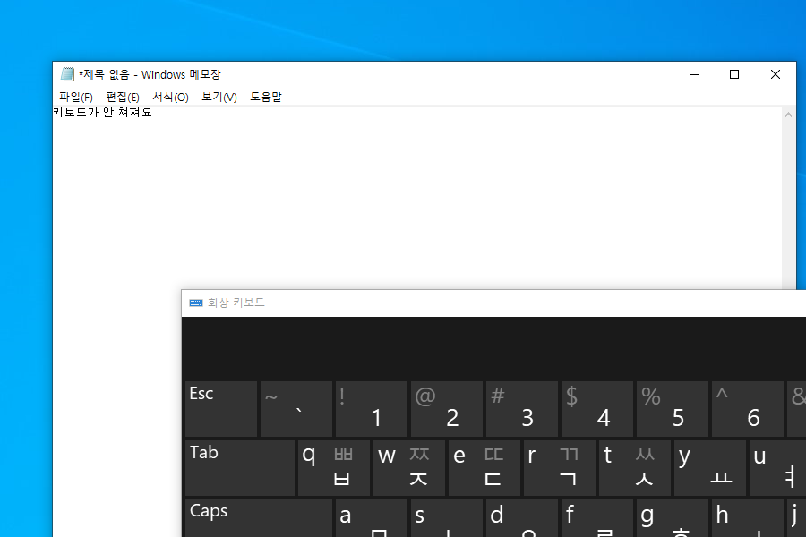 키보드가 안쳐져요 해결 방법 화상 키보드가 잘 작동되는지 확인해보기 위해, 메모장을 실행시켜 보았습니다.