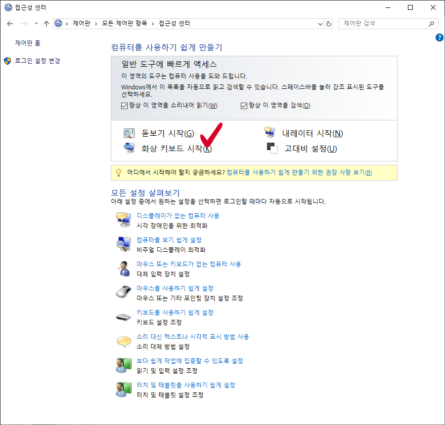 해당 화면에서 '화상 키보드 시작' 항목을 클릭해주세요.