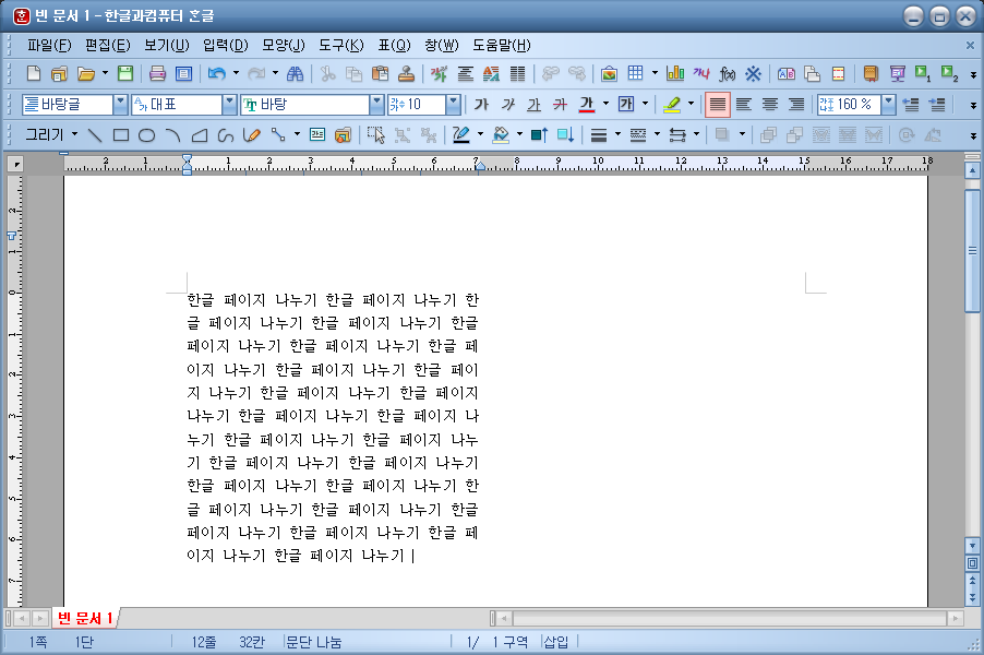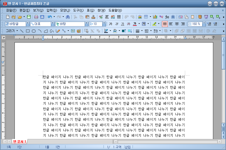 방법을 알려드리기 위해, 먼저 한글 페이지 나누기라는 문장을 나열해보았습니다. 일반적으로는 한글 프로그램에서 글씨를 작성하게 되면 위와 같이 글자가 나열됩니다.