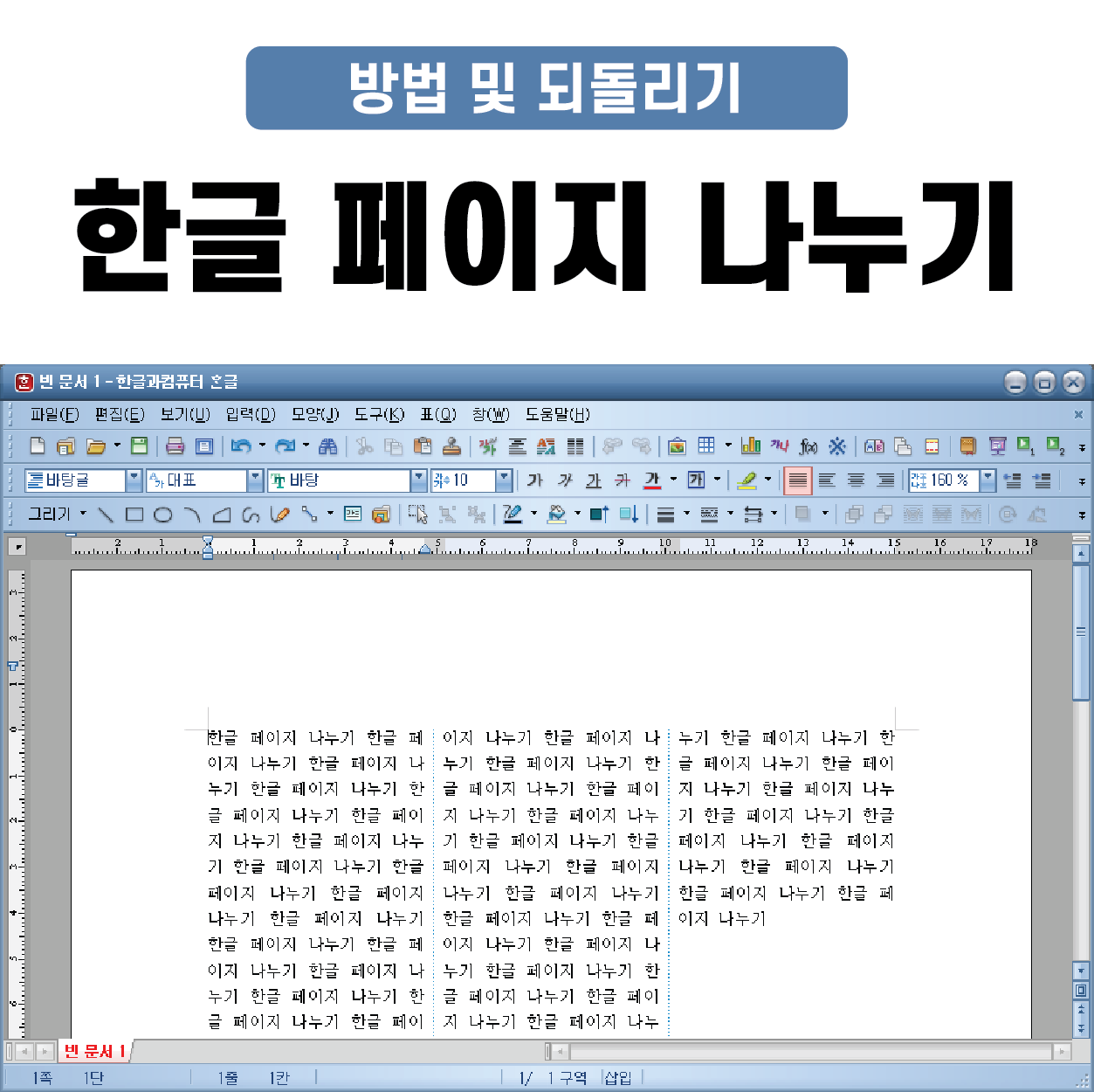 이번에는 한글 페이지 나누기를 셋으로 설정해보았습니다. 영역이 세 개로 나뉘었습니다.