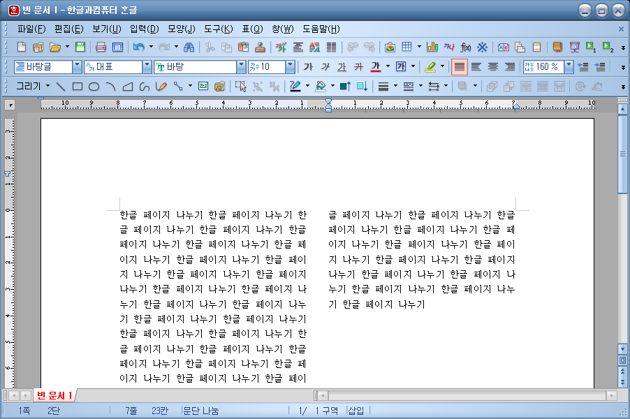 필기시험을 볼 때 시험지의 한 면이 두 개의 구간으로 나뉘어 있는 것을 보신 적이 있으실 겁니다. 대부분의 시험지들은 구간이 두 개로 나뉘어 있기 때문입니다. 이렇게 구간을 나눠 시험문제를 작성하는 것도 한글 페이지 나누기 기능을 이용한 것입니다.