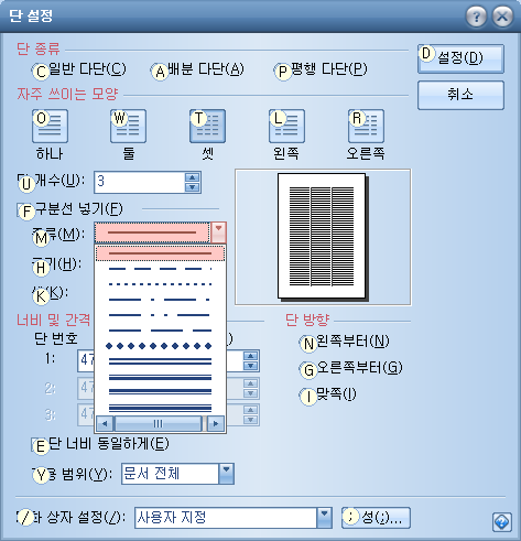 단 설정 창이 띄어진 모습입니다. 단 설정 창의 자주 쓰이는 모양 항목을 봐주시기 바랍니다. 하나, 둘, 셋, 왼쪽, 오른쪽 등 다섯 개의 항목이 있습니다. 하나는 말 그대로 한 페이지 그대로 작업하는 것, 둘은 페이지를 두 영역으로 나누어 작업하는 것, 셋은 페이지를 세 영역으로 나누어 작업하는 것을 말합니다.