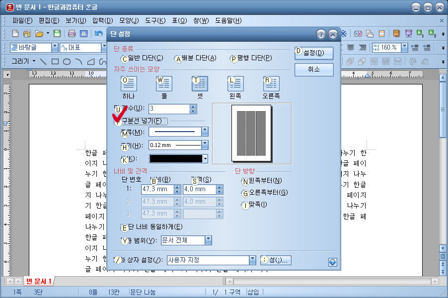 영역을 좀 더 제대로 구분하고 싶다면 단 설정 창을 통해 구분선 넣기도 가능합니다.